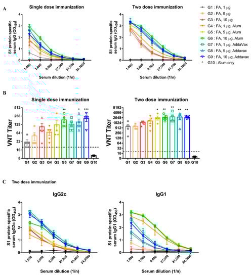 All immunized groups, with or without adjuvants, survived and showed no weight loss (Figure S2). In the adjuvant groups (G4 to G9), S1 specific IgG and neutralizing antibody titers were higher than those in the groups without adjuvants (G1 to G3) at the same dose (Figure 5A,B). As shown in Figure 5B, the AddaVax groups exhibited higher neutralizing antibody levels than the alum groups at the same dose, regardless of the number of immunizations. To evaluate the effect of the adjuvant on Th1 and Th2 immune responses, we measured antibody titers of IgG2c and IgG1a. We found that the AddaVax groups had higher IgG2c levels involved in the Th1 than the alum groups (Figure 5C). Overall, these results suggest that FA-inactivated MERS-CoV was immunogenic by itself; however, the addition of adjuvants improved its immunogenicity depending on the type of adjuvant used. In particular, AddaVax appeared to be a more potent adjuvant than alum in this study.