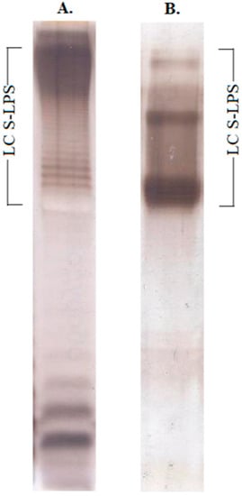 Silver-stained SDS polyacrylamide gel of S-LPS from E. coli O157 (A) and E. coli O104 (B). LC S-LPS indicate S-LPS with long-chain O-polysaccharide.