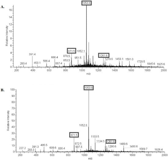 Mass spectra of lipid A (LA) of Ac3-S-LPS E. coli O157 (A) and of Ac3-S-LPS E. coli O104 (B). The peak at m/z 1053.6 (major) belongs to tri-acylated LA; peaks at m/z 871.5 and 1261.6 belong to di- and tetra-acylated LA, respectively. All species of LA are monophosphoryl.