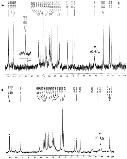 13C NMR spectra of Ac3-S-LPS E. coli O157 (A) and Ac3-S-LPS E. coli O104 (B). (CH2)n indicates methylene groups of fatty acids.