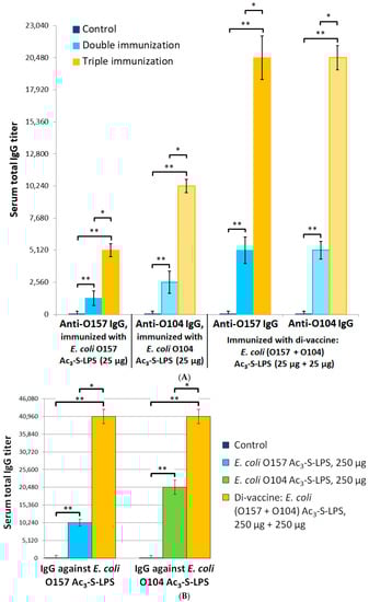 We found that double and triple i.p. immunization with Ac3-S-LPS E. coli O157 or Ac3-S-LPS E. coli O104 or di-vaccine combination thereof at a dose of 25 µg of each antigen elicited E. coli O157 and O104 LPS-specific IgG response in mice, and IgG titers were 64-fold and higher than those for the control group. Thus, E. coli O157 and O104 LPS-specific IgG confer systemic protective immunity against i.p. challenge with homologous STEC strains at a lethal dose (60–100% protective efficacy), which agrees with similar results of other researchers [,,]. However, protection against the oral administration of pathogenic E. coli O157 and E. coli O104 in mice vaccinated three times with LPS monocomponents, or di-vaccine, at doses of 25 or 50 μg, has not been achieved.