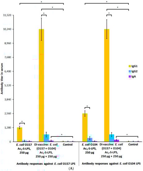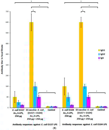 Of particular interest was the study of the immune response in mice immunized with a high dose of vaccine preparations and demonstrating mucosal immunity to STEC infection. E. coli O157 and O104 Ac3-S-LPS and E. coli (O157 + O104) Ac3-S-LPS di-vaccine elicited serum O-specific IgG after third injection at a dose of 250 µg of each antigen (Figure 4B). The highest levels of serum E. coli O157 and O104 LPS-specific IgG were again elicited by E. coli (O157 + O104) Ac3-S-LPS di-vaccine and the titer was 1:40,960 for both antigens. These were two- to four-fold higher (p < 0.05, ANOVA) than IgG titers following immunization with single-antigen preparations (1:10,240 for Ac3-S-LPS E. coli O157 or 1:20,480 for Ac3-S-LPS E. coli O104). The titers of control sera were <1:20 for each antigen, thus all Ac3-S-LPS preparations induced at least 512-fold rise in serum O-specific IgG-titers (p < 0.05, ANOVA). We found that IgG1 was the dominant subclass in the sera and feces (Figure 5A,B). The highest levels of IgG1 were elicited by Ac3-S-LPS E. coli (O157 + O104) di-vaccine and these titers for both antigens were 1:10,240 in the sera and 1:640 in the feces, which were 1024- and 64-fold higher (p < 0.05, ANOVA), respectively, than those in control sera and coprofiltrates (<1:10 for both antigens). Vaccine antigen Ac3-S-LPS E. coli O157 elicited 128- and 8-fold increases in serum or fecal IgG1 titers, respectively, compared to the control group (p < 0.05, ANOVA). Another antigen, Ac3-S-LPS E. coli O104, elicited 256 and 16-fold higher titers in the sera and feces, respectively, after triple injection, compared to the control group (p < 0.05, ANOVA). It should be noted that Ac3-S-LPS E. coli (O157 + O104) di-vaccine under the 10-fold dose escalation induced similar IgA response for both antigens in the sera (1:160 titer) and in the feces (1:80 titer) which were 16- and 8-fold higher (p < 0.05, ANOVA), respectively, than those for the control group (<1:10 for each antigen). Single Ac3-S-LPS E. coli O157 or Ac3-S-LPS E. coli O104 preparations were less immunogenic and elicited two- to four-fold increases in IgA titers in the sera and feces compared to the control group (p < 0.05, ANOVA). Modification of the serological response profile with increasing vaccine dose is an interesting feature of these antigens. Ac3-S-LPS immunogen becomes capable of the simultaneous activation of both the systemic and local specific immune responses.