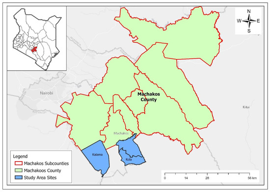 The study was conducted in Machakos Town sub-county, Kenya, which is located 61.6 km southeast of Nairobi, Kenya’s capital city. Machakos Town sub-county has 7 wards, from which Kola and Kalama wards were purposively selected because they own chickens and goats (Figure 1). Machakos Town Sub-county’s population is estimated to be 170,606. The climate is semi-arid, and the county has an altitude of 1000 to 2100 m above sea level. It lies between latitudes 0.45′ S and 1.31′ S and longitudes 36.45′ E and 37.45′ E and covers an area of 6850 km2. The average rainfall ranges from 500–1300 mm, and the average temperature is 18–25 °C. Subsistence agriculture is the main farm activity. Maize and drought-resistant crops, such as sorghum and millet, are grown due to the area’s semi-arid state.