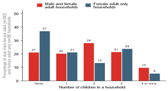 In the sampled households, the average household has five members, one of which is a child aged (0–18 years). The average number of children living in a household is 2 (median = 2, IQR: 1–3 children). Figure 2 shows the distribution of household size and number of children living in the surveyed households, respectively. Household size differs significantly by house type (p-value < 0.001); a majority (74%) of the female adult only households have 4 members and below. At least one-third (37%) of female-adult only households have no children compared to 21% of dual male and female adult households.