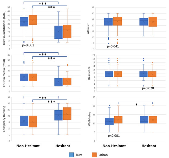 Composite (sum) scores were calculated for trust in information sources, institutions, conspiracy theories, altruism, resilience, and well-being. Significant differences between urban and rural residents were found in trust in institutions (p < 0.001), altruism (p = 0.046), resilience (p = 0.045), and well-being (p < 0.001). The total scores for trust in the media (p < 0.001), trust in institutions (p < 0.001), and conspiracy theories (p < 0.001) were significantly different between the vaccine-hesitant and non-hesitant participants (Figure 1).