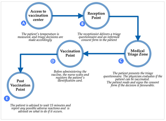 Furthermore, according to the legal procedure for vaccination against COVID-19 and the protocol for persons seeking vaccination approved by Ministry Order no. 2171/2020, the patient traffic flow is divided into five steps (Figure 1).