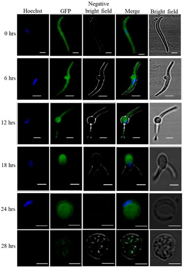Figure 1. Axenic transformation of eGFP expressing P. yoelii p230p(−) salivary gland sporozoites into LS. In-vitro host cell free cultured salivary gland sporozoites completely transform into early LS after 24 hrs of incubation. To follow the cell free transformation of salivary gland sporozoites into early exoerythrocytic forms, we used eGFP expressing Pyp230p(−) and followed the transformation by confocal microscopy of cultured sporozoites at 6 hrs intervals for 24 hrs. At 28th of Axenic LS culture we could not find any good GFP images. Scale bars 2 µm.