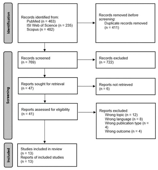 The initial search resulted in 1180 relevant articles across the three databases (i.e., PubMed, ISI Web of Knowledge, and Scopus). After removing duplicates (411 duplicate articles), the initial search resulted in 769 eligible articles. The initial screening by title and abstract resulted in a total of 722 articles being excluded based on the main topic addressed. The remaining 47 articles were screened by full text; six articles did not have a full-text version available online; therefore, 41 full-text articles were screened. After excluding 28 articles due to inadequate topic, language different than English or Italian languages, wrong publication type (e.g., editorials, commentaries, conference proceedings), or wrong outcome measure, the remaining 13 were included in our systematic review based on full text (Figure 1). Any conflict about the inclusion or exclusion of the articles was resolved by internal discussion between the researchers.