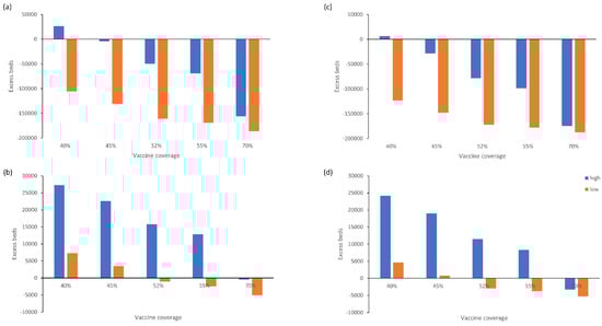 Excess (a) acute and (b) ICU beds used for treatment of COVID-19 and influenza patients by vaccine coverage (base case scenario: QIVe for all age groups) and (c) acute and (d) ICU beds used for treatment of COVID-19 and influenza patients by vaccine coverage (scenario 2: QIVc for 6 months to 64 years, aQIV for ≥65 years) during high and low incidence influenza seasons.