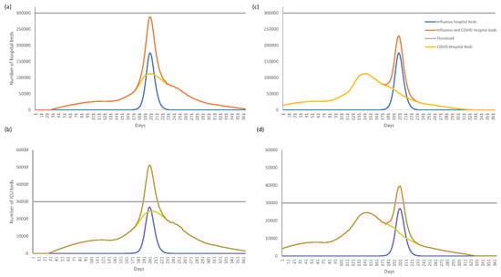 The timing of the peak bed occupancy of COVID-19 and influenza also substantially influenced the total number of beds occupied. In a high influenza incidence season where the peaks of COVID-19 and influenza epidemics coincide and 45% of the population has received influenza vaccination, ICU bed occupancy remained considerably over the 30,000-bed threshold for the duration of the influenza epidemic peak, whereas acute hospital beds occupied remained below the 300,000 threshold (Figure 2a,b). If the COVID-19 peak bed occupancy occurred 50 days or more before the influenza peak, total ICU bed occupancy was reduced but remained above 30,000 (Figure 2c,d). A vaccination rate of 65% was need to reduce ICU bed occupancy below the 30,000 threshold (Figure 3).