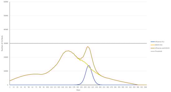 ICU bed occupancy over time for the base case scenario (QIVe for all age groups) where peak COVID-19 bed occupancy occurs 50 days before peak influenza bed occupancy and assuming an influenza vaccine coverage of 65%.
