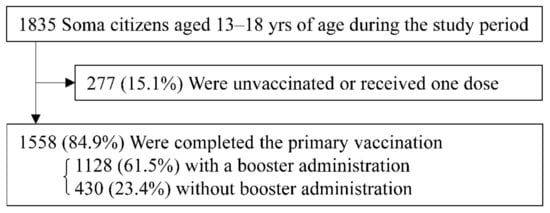 Immunization status of study population. The study population is shown for the analysis of the effectiveness of a booster administration of SARS-CoV-2 vaccination for adolescents in Soma, Fukushima, Japan.