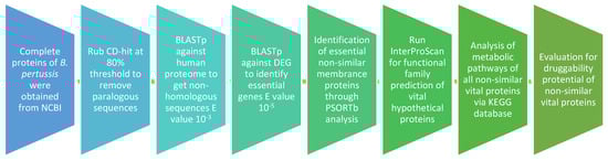 For the recognition of vital proteins in the B. pertussis strain B1917, Subtractive Genomics method was applied, which was then examined to identify the expected drug targets. To estimate their draggability capacity, the recognized drug targets were passed via a database of Drug Bank. An overview of the overall workflow is shown in Figure 1.