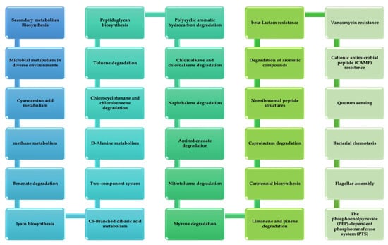 Pathways of carbon fixation are found in prokaryotes, methionine and cysteine metabolism, metabolism of nitrogen, ketone bodies degradation and synthesis, metabolism of glycerophospholipid, metabolism of purine, leucine, valine and isoleucine biosynthesis, metabolism of aspartate, mismatch repair, alanine and glutamate, proline and arginine metabolism, lysine biosynthesis, serine and threonine metabolism, hypotaurine and taurine metabolism, breakdown of fatty acid, histidine metabolism, arginine biosynthesis, riboflavin metabolism, biosynthesis of monobactam, bacterial secretion system, biosynthesis of CoA and pantothenate, breakdown of leucine, valine, and isoleucine, metabolism of D-ornithine and D-arginine, metabolism of chlorophyll and porphyrin, degradation of lysine, biotin metabolism metabolism of glycerolipid, terpenoid backbone biosynthesis, biofilm formation-pseudomonas aeruginosa, cationic antimicrobial peptide (CAMP) resistance, phenylalanine metabolism, biosynthesis of phenylalanine, biosynthesis of tryptophan and tyrosine, beta-alanine metabolism, seleno compound metabolism, biosynthesis of lipopolysaccharide, biosynthesis of peptidoglycan, nicotinate and nicotinamide metabolism, ribosome, protein export, DNA replication, homologous recombination, pertussis, ABC transporters, quorum sensing, thermogenesis, bacterial chemotaxis, flagellar assembly, PPAR signaling pathway, vancomycin resistance and beta-lactam resistance. Figure 3 shows distinctive pathways of metabolism. The proteins related to these pathways are the most potent drug targets; due to the non-availability of antagonist pathways in humans, the side effects are sporadic.