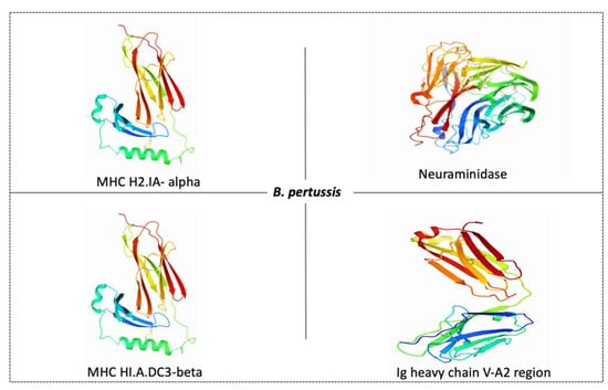 Possible protein targets and their structures for vaccine development against B. pertussis. PDB ID of MHC H2-IA-alpha is 1MHC, neuraminidase is 5TSP, MHC HLA-DC3-beta is 3HPJ and Ig heavy chain V-A2 region is 1IGM.