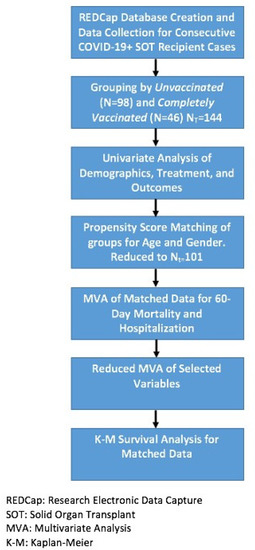 After obtaining approval by the University of Arkansas for Medical Sciences Institutional Review Board (IRB 262269), a de-identified prospectively populated institutional database was built, registering consecutive COVID-19 positive SOT recipients from 1 February 2020 through 3 January 2022 (Study flow chart, Figure 1) [3]. Included patients were those at or above 18 years of age with a functioning liver, kidney, or simultaneous liver-kidney (SLK) allograft at the time of enrollment, who had tested positive for COVID-19 infection via nasopharyngeal polymerase chain reaction testing. Patients were entered into the database by a coded study number. Data captured included recipient demographics, comorbidities (diabetes, hypertension, obesity, coronary artery disease, cerebrovascular disease, and cancer), immunosuppression regimen, COVID-19-related hospitalization and treatment modalities, COVID-19 vaccination status, vaccination type and timing, and 60-day mortality. Patients were categorized as vaccinated vs. unvaccinated, based on their COVID-19 vaccination completion status. Complete vaccination was defined as greater than or equal to two weeks following two doses of mRNA (Pfizer or Moderna) COVID-19 vaccination or greater than or equal to two weeks following one dose of the Johnson & Johnson’s Janssen COVID-19 vaccination. Patients who had received a single dose of mRNA vaccine were categorized as unvaccinated.