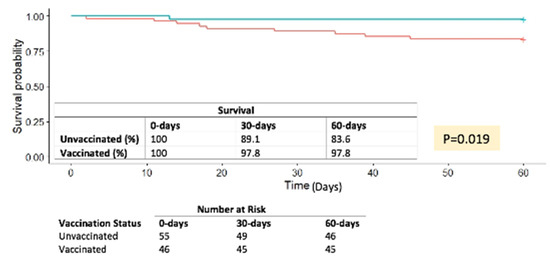 Matched-dataset K–M survival analysis showed an 8.7% and a 14.2% survival benefit for the vaccinated group at 30 and 60 days post-COVID-19 diagnosis, respectively (log rank p = 0.019) (Figure 2).