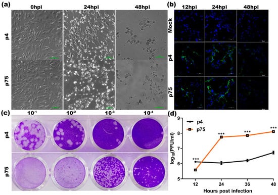 RGCB 355/KL08, a whole-genome characterized human isolate from the 2008 outbreak that belonged to the East/Central/South African genotype [85,86] was passaged four times in Vero cells and was labelled as parent virus RGCB 355/KL08-p4 (p4) for this study. U-87 MG cells, human astrocytoma cells, were infected with RGCB 355/KL08-p4 and sequential passaging was continued until the 75th passage to produce the live-attenuated CHIKV strain, RGCB 355/KL08-p75 (p75). The replication kinetics of the parent virus (p4) and the attenuated strain (p75), as well as the changes in the cell morphology upon infection, were compared by infecting the U-87 MG cells with both of the viral variants at MOI 1. The incidence of cytopathic effect was early for p75 and was evident with changes such as rounding and intracytoplasmic granulation, as seen from the bright field as well as the immunocytochemistry images (Figure 1a,b). Plaque morphology was consistent throughout the experiment, with p75 forming small discrete plaques, as compared to p4, which had larger and more diffused plaques (Figure 1c). To understand the replication efficiency of the viral variants, the supernatants at different times post infection were collected and titrated in Vero cells through plaque assay. The viral titer of p75 started to peak at 24 h post-infection (hpi) with a 2-log increase (p75 vs. p4 *** p < 0.001) and then plateaued until 48 hpi (36 hpi and 48 hpi *** p < 0.001), whereas p4 replicated gradually and peaked only at 48 hpi.