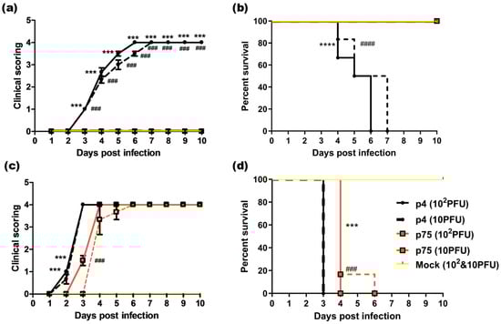 In vivo evaluation of infectivity of p4 and p75 CHIKV strains in susceptible mice. Neonatal, 3-day-old BALB/c mice (n = 24/group) as well as 3- to 4- week-old AG129 mice (n = 6/group) were infected subcutaneously with 102 (solid line) and 10 PFU (dashed line) of p4 and p75. Mock-infected group received the same amount of DMEM (n = 24/gp for BALB/c and 6/group for AG129) and is shown in yellow line with a dash. Data were pooled from 3 independent experiments and are presented as the means ± SEM. (a) Clinical scoring of infected BALB/c mice. The appearance of signs of disease in mice was monitored daily. Clinical score scale: 0—normal behavior, 1—generalized cachexia, 2—walking difficulty and patchy alopecia, 3—epileptic seizures and ataxic gait, and 4—dead. Two-way ANOVA with Bonferroni test to compare the replicate means by row was applied. *** p value corresponds to p < 0.001 (p4 vs. p75 inoculated with 102 PFU) and ### p value corresponds to p < 0.001 (p4 vs. p75 inoculated with 10 PFU). (b) Survival graph of infected BALB/c mice. Survival was compared using Kaplan–Meier survival curves (log rank test). **** p < 0.0001 (p4 vs. p75 inoculated with 102 PFU) and #### p < 0.0001 (p4 vs. p75 inoculated with 10 PFU). (c) Clinical scoring of infected AG129 mice. The appearance of signs of disease in mice was monitored daily. Clinical score scale: 0—normal behavior, 1—lethargy/weight loss, 2—hunched back posture, 3—convulsions, and 4—dead. Two-way ANOVA with Bonferroni test to compare the replicate means by row was applied. *** p value corresponds to p < 0.001 (p4 vs. p75 inoculated with 102 PFU) and ### p value corresponds to p < 0.001 (p4 vs. p75 inoculated with 10 PFU). (d) Survival graph of infected AG129 mice. Survival was compared using Kaplan–Meier survival curves (log rank test). *** p < 0.001 (p4 vs. p75 inoculated with 102 PFU) and ### p < 0.001 (p4 vs. p75 inoculated with 10 PFU).