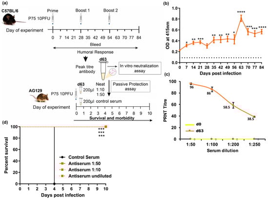 A schematic representation of the experiment is depicted in Figure 3a. Initially, we generated the protective antibody containing sera by immunizing 4- to 6-week-old C57BL/6 mice (n = 6) subcutaneously with 10 PFU of the attenuated strain p75. Booster doses were given on day 28 and day 56 of immunization and serum was collected in weekly intervals up to day 84 of immunization. The humoral response was evaluated in an indirect ELISA using a purified ΔE2 CHIKV antigen. We observed that CHIKV-specific antibody levels significantly elevated at day 63, soon after the administration of the second booster dose (Figure 3b). Sera from mice at day 63 post-vaccination (n = 6) had the maximum titer and were pooled. The serum was checked for its ability to neutralize the CHIKV infection in vitro using the plaque reduction neutralization test (PRNT). These antibodies neutralized CHIKV efficiently and a PRNT90 was obtained in a 1:75 dilution (Figure 3c) of the serum.