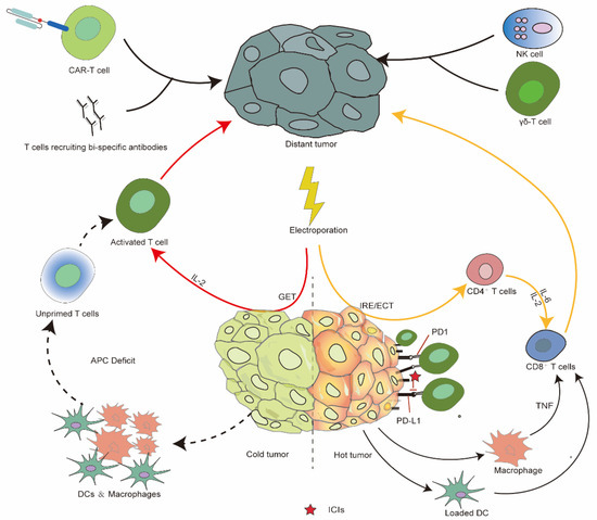 IRE has been reported to augment checkpoint inhibitor and immune-cell transfer therapies in a number of tumors. IRE in conjunction with anti-CTLA-4 promoted the robust infiltration of tumor-specific CD8+ T cells both locally and systemically in a prostate mouse model, leading to a significant improvement in CR compared with anti-CTLA-4 monotherapy (47% versus 15%). In other preclinical studies, IRE + anti-PD-L1 + TLR3 and TLR9 agonist combination regimen cooperatively induced tumor-infiltrated CD4+ and CD8+ cells both locally and peripherally. Further, the combination therapy modulated the tumor microenvironment by increasing the immunogenic M1 macrophages and type-1 conventional dendric cells and by reducing immunotolerant Treg cells, myeloid-derived suppressor cells, and plasmacytoid DCs, resulting in complete rate of 100% in both lymphoma and breast cancer models, and significantly improved the outcome of the monotherapy or dual therapy [159]. Recently, clinical studies investigating the combination of IRE and checkpoint inhibitors mainly focused on advanced pancreatic cancers. A retrospective study that included 85 patients of advanced pancreatic cancers revealed a median OS of 44 months in IRE plus toripalimab (an anti-PD-1 inhibitor) group. Of note, only 15 of 85 patients received the dual therapy [160]. The study also found that the dual therapy steadily increased tumor-specific CD4+ and CD8+ cells and circulating cytokines such as IL-4, IL-5, and IFN-γ. Similar findings have also been reported in patients with prostate cancers and hepatocellular carcinomas [161,162]. Figure 3 shows how electroporation-related therapies in combination with immunotherapies enhance the systemic immune antitumor response in “cold” and “hot” tumors.