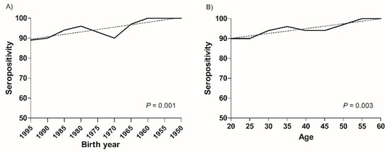 Changes of seroprevalence of varicella-zoster virus in healthcare workers according to birth year and age groups. The seroprevalence of varicella-zoster virus in healthcare workers significantly decreased according to (A) the birth year groups (p = 0.001) and (B) the age groups (p = 0.003).