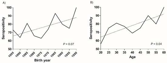 Changes of seroprevalence of measles in healthcare workers according to birth year and age groups. The seroprevalence of measles in healthcare workers decreased according to (A) the birth year groups (p = 0.07) and (B) significantly decreased according to the age groups (p = 0.04).
