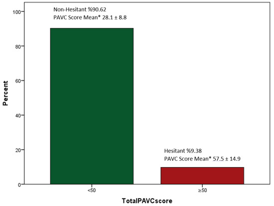 In our study, 9.38% of participants are VH. In the literature, the prevalence of VH in PACV varied from 5% to 34.7% in different countries (using the conventional PACV cut-off) [14,15]. Hence, there is a need to conduct studies at different time points in different regions to predict vaccination hesitancy in Turkey.