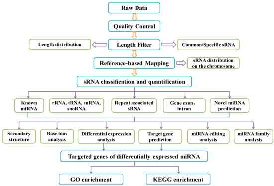 HD11 cells were treated with 100 ng/mL BP7 and 10 ng/mL BSA for 48 h, and the total RNAs of the treated HD11 cells were collected with Trizol (Takara, Japan). The high throughput sequencing and library construction of miRNA were completed by Novogene Company (Beijing, China). Simply, after quality detection of the RNA sample, the cDNA library was constructed following the small RNA sample pre kit and sequencing. In addition, based on the reference genome of the chicken species, the biological information was analyzed following the schematic diagram (Figure 1). Based on GO and the Kyoto encyclopedia of genes and genomes (KEGG) pathway database, the differentially expressed genes (DEGs) were compared and analyzed with a p-value of less than 0.05.