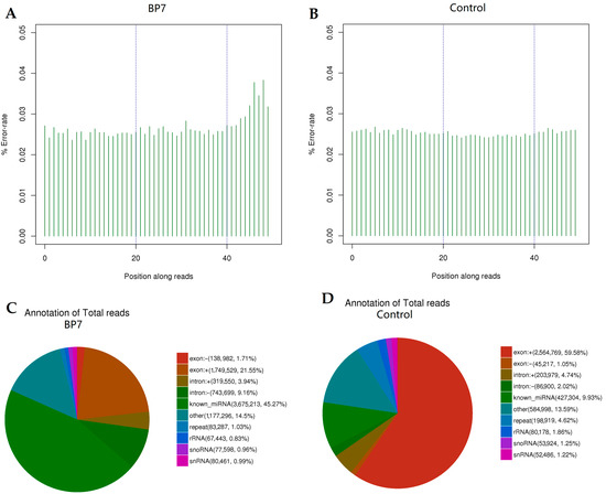 In addition, the original data error rate distribution was checked, as showed in Figure 3A,B. The sequencing error rates of the BP7 stimulated sample and its control were lower than 0.5%, indicating that the sequencing results were good.