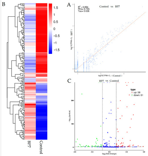 The correlation of microRNA expression levels between BP7 and control is an important indicator to test the reliability of experiments and the rationality of sample selection. The expression quantity correlation scatter plot is displayed in Figure 4A. The correlation coefficient was 0.854, suggesting that the expression pattern between BP7 and control was of high similarity. The fold change and q value were used to evaluate the expressed different miRNA, whose heat map analysis is shown in Figure 4B. It was observed that compared with the control, BP7 stimulated 119 differentially expressed miRNAs in HD11 cells, including 8 up-regulated miRNAs and 61 down-regulated miRNAs. The overall distribution of differential miRNAs is listed in the volcano map (Figure 4C).