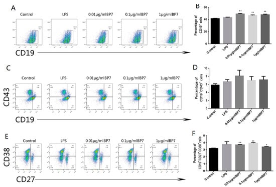B cell subtype with BP7 treatment in vitro. The spleen cells were collected from the mice immunized with the H9N2 AIV vaccine, and were stimulated with BP7 at three dosages for 48 h. BSA treatment was used as control. (A) Flow cytometry plot of CD19+ B cells with BP7 treatment. (B) Histogram of CD19+ B cells percentage with BP7 treatment. (C) Flow cytometry plot of CD19+CD43+ B cells with BP7 treatment. (D) Histogram of CD19+CD43+ B cell percentage with BP7 treatment. (E) Flow cytometry plot of CD27+CD38+ B cells with BP7 treatment. (F) Histogram of CD27+CD38+ B cells with BP7 treatment. * p < 0.05, ** p < 0.01, compared to that of control.