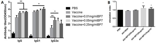 In order to study the effects of BP7 on the humoral and B cell immunity, mice were twice immunized with avian influenza vaccine, and with 0.01, 0.05, and 0.25 mg/mL BP7, respectively, and the changes in serums IgG, IgG1, and IgG2a were detected by ELISA. The results showed that compared with the vaccine control, the immunization groups with three doses of BP7 significantly promoted the increase in IgG levels in mice (Figure 7A, IgG). It was observed that the 0.25 mg/mLBP7 group significantly stimulated the increase in IgG1 levels in mice (Figure 7A, IgG1), and that 0.01 mg/mL BP7 and 0.05 mg/mL BP7 also significantly stimulated the increase in IgG2a levels in mice (Figure 7A, IgG2a). In addition, it was found that compared with the AIV vaccine control, the group immunized with 0.05 and 0.01 mg/mL BP7 combined with the AIV vaccine significantly stimulated the activity of splenic lymphocytes (Figure 7B). These results indicated that BP7 might stimulate the antibody immune in the immunized mice.