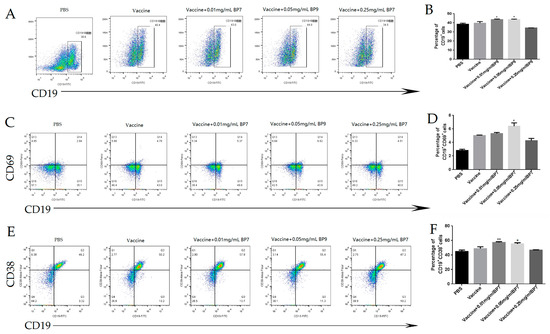 In this paper, B cell differentiation and activation in the mice immunized with the AIV vaccine and BP7 were detected with FCM. The results showed that compared with the vaccine group, the percentages of CD19+ total B cells in the 0.01 mg/mL and 0.05 mg/mL BP7 combined vaccine experimental groups were significantly increased (Figure 8A,B). Compared with the vaccine group, the number of CD19+CD69+ activated B cells in the 0.05 mg/mL combined vaccine immunized group was significantly increased, and was greater than that of the vaccine group (Figure 8C,D). Additionally, compared with the vaccine group, the percentages of CD19+CD38+ cells in the 0.01 mg/mL and 0.05 mg/mL BP7 combined immunization groups were increased, with the most significant increase of 0.01 mg/mL. However, the percentage of CD19+CD38+ cells in the 0.25 mg/mL BP7 combined immunization group was lower than that of the vaccine group (Figure 8E,F). These results suggested that BP7 might have the dual regulatory effects on B cell differentiation in vivo. A low concentration of BP7 could promote the proliferation and differentiation of B cells, while a high concentration of BP7 might inhibit the proliferation and differentiation of B cells. Thus, the dose of BP7 and activation of B cells still might need to be further explored.
