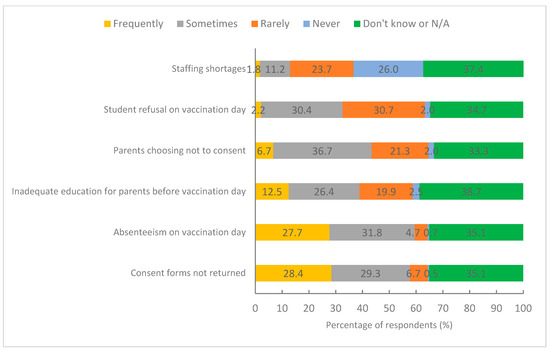 Survey respondent perception of the frequency of factors impacting school-based HPV vaccination coverage (n = 447).