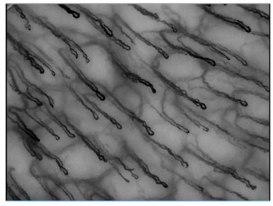 Videocapillaroscopy allows the study of the morphological and architectural structure of the microcirculation and its hemodynamic conditions by a polarized light videomicroscope, whose images are saved and analyzed through dedicated software, which extrapolates the main hemodynamic and morphometric information about capillaries [45,46,47,48,49].