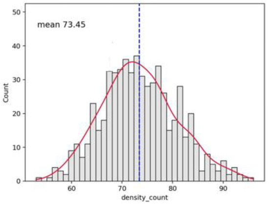 Histogram distribution of capillary density for the whole video (see Figure 1). The dashed line indicates the mean value (73.45 in this case); the red line interpolates the data for clearer reading.
