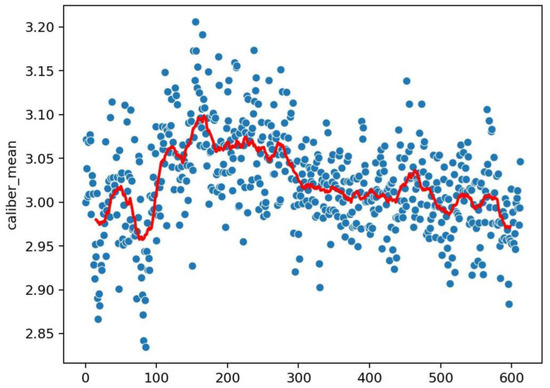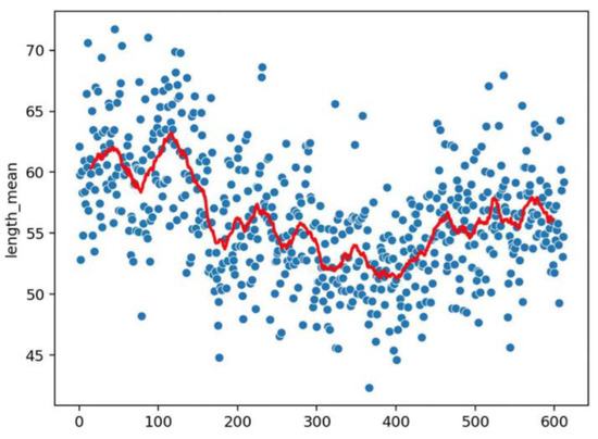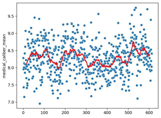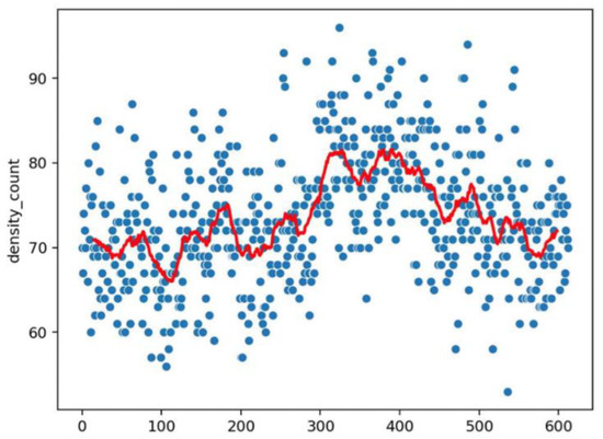 Dot representation of Figure 2. In this case, we can detect eventual anomalies during the acquisition (e.g., out of focus). The x axis represents the frame of the video; the y axis is the density for the considered frame; the red line interpolates the data for clearer reading.