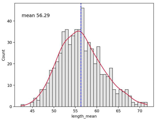 Histogram distribution of loop length for the whole video. As for Figure 2 the dashed line indicates the mean value (56.29 in this case); the red line interpolates the data for clearer reading.