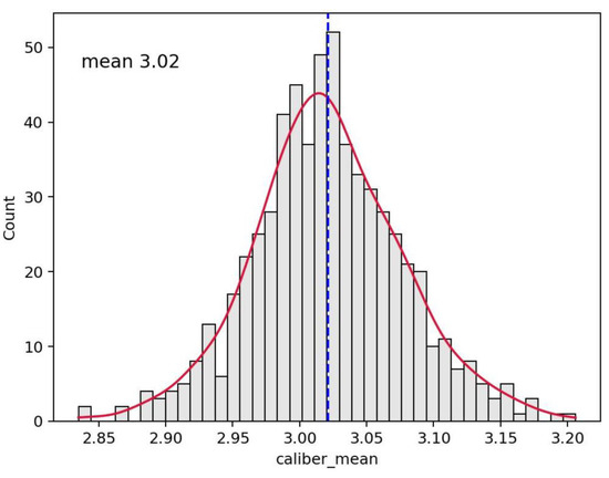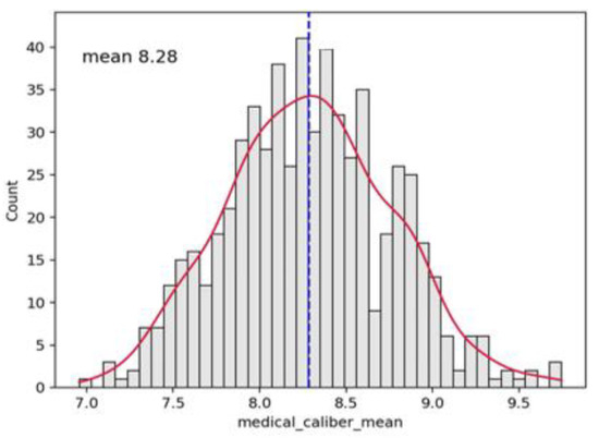 Histogram distribution of loop diameter for the whole video. The dashed line indicates the mean value equal to 8.28 in this case.