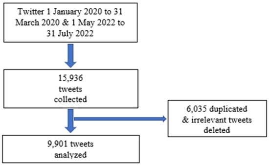 Our sampling approach was purposive, as shown in Figure 1. Tweets related to COVID-19 between 1 January 2020 and 31 March 2020 and monkeypox between 1 May 2022 and 31 July 2022 were selected. We recruited tweets in the German language and restricted our search to Germany only. Tweets which were not about COVID-19 or monkeypox or were in another language were not selected.