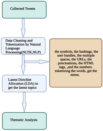 After using (NLP) and (LDA), a qualitative approach using thematic analysis examined the COVID-19 and monkeypox tweets [13,14,15,16,17]. Qualitative research does not rely on variables, predictive models, or hypotheses, but examines data to explain the how, the what, and the why behind peoples’ thinking beyond what a survey or other quantitative measures can capture [18,19]. Developing an understanding of the way in which people interpret a phenomenon is the goal: “Like healthcare, education involves complex human interactions that can rarely be studied or explained in simple terms. Complex educational situations demand complex understanding; thus, the scope of educational research can be extended by the use of qualitative methods” [20] (p. 1).