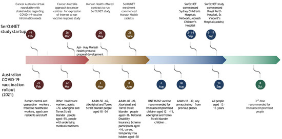 Timeline of Australian COVID-19 vaccine rollout and SerOzNET study startup [16,17,18,19,20,21,22].