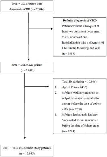 The study cohort comprised all patients diagnosed with CKD (according to International Classification of Diseases, Ninth Revision, Clinical Modification [ICD-9-CM] code 585.X) over a 12-year period (n = 32,844) from 1 January 2001 to 31 December 2012. We excluded patients without at least two outpatient department visits or at least one hospitalization in which the diagnosis was CKD in the following year (n = 9353) due to the uncertainty of their CKD diagnoses. To ensure that no patient had cancer before enrollment, we included a 1-year washout period starting on January 1, 2000. In addition, patients were excluded if they were aged less than 55 years (n = 6432) or had received an inpatient or outpatient diagnosis of cancer before the date of enrollment (n = 2780) or influenza vaccination within 6 months before the date of enrollment (n = 2097). In total, 12,985 patients were included (Figure 1). In Taiwan, the public health policy has been offering influenza vaccinations to high-risk individuals (i.e., those with chronic pulmonary diseases, cardiovascular diseases, chronic liver infection, liver cirrhosis, or type 2 diabetes mellitus) aged more than 50 years at no cost since 1998 and to all individuals aged more than 65 years since 2001 []. We analyzed the vaccination status by the ICD-9-CM code V048 or by the vaccine drug codes. The incidence of primary liver cancer (ICD-9-CM code 155.X) in CKD patients was indicated as the primary endpoint of our study in the follow-up years. The follow-up ended on 31 December 2012 or when the patients received a new liver cancer diagnosis, withdrew from NHI, were lost to follow-up, or died.