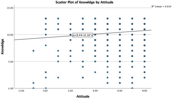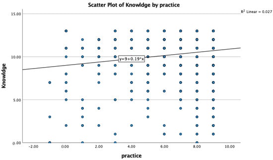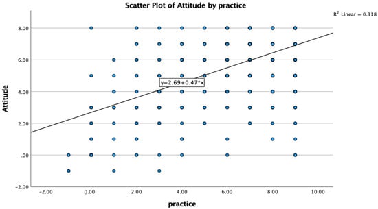 The Spearman two-tailed correlation analysis between the knowledge and practices of the target population showed a negligible positive association with a correlation coefficient of 0.07 (Figure 1, Table 5). Similarly, knowledge and attitude of the target population also showed negligible positive association with a correlation coefficient value of 0.05 (Figure 2, Table 6). Interestingly, a moderate positive association was observed between attitude and practice of the respondents with a correlation coefficient of 0.367 in Asir (Figure 3, Table 7).