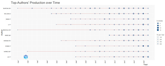 Table 2 depicts the most prolific authors in vaccine design research publications. It is observed that D R Burton is the most productive author in vaccine design publication with 86 publications, he also received the maximum number of citations, i.e., 18,449 total citations followed by “IA Wilson”, who contributed 63 publications with 7926 citations and A B Ward with 48 publications and 4814 total citations. The study also showed that all the top ten most prolific authors are geographically located in the USA and two of the then authors are affiliated with MIT (Massachusetts Institute of Technology, Cambridge, MA, USA) and two authors from SRI (Scripps Research Institute, San Diego, CA, USA). The analysis of the author’s productive life using R Studio in vaccine design research as shown in Figure 1 revealed that D R Burton and “IA Wilson” published frequently and received a significant number of citations too in their research publications.