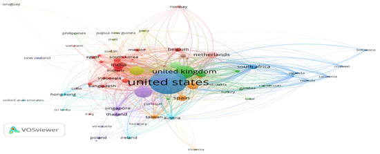 Figure 2 represents the network visualization of the citation analysis when the element of analysis is a country. The criterion for generating the network was set with countries having at least two citations and a minimum of four documents. There were 81 countries meeting the criteria based on these countries and they were grouped into 13 clusters and 1112 links with total link strength of 20,653. By going through the network map on countries based on the citation, it was observed that the USA received a maximum citation of 127,487 with 12,194 link strength followed by the UK with 37,509 total citations and 4791 total link strength and Australia with 14,260 total citations with 1753 link strength ranking second and third, respectively.