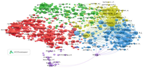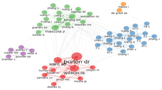 In order to find out the most cited authors in vaccine design research during the epoch, we set the criteria with authors having at least the minimum five citations. A total of 1191 of 252,560, authors meet the threshold. Further, it was observed that they have been grouped into five clusters with 409,123 links. The top three cited authors are “Burton, D.R.” (419,967 Link strength), “Kwong, P.D.” (227,336 Link Strength) and “Moore, J.P.” (222,480 Link Strength) (Figure 3).