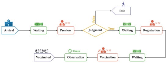 A simulation model is a numerical evaluation tool that studies various practical methods of system modeling, making assumptions based on various real-world scenarios and constructing models with software for the purpose of system analysis, design and evaluation []. To represent the workflow of vaccinations, a discrete-event simulation model was constructed through Arena software and was based on the basic concepts of resources, entities, locations, processes and attributes []. In this study, the resources referred to the staff at the preview, registration and vaccination steps, and the entities referred to the vaccination recipients. The location was the service desk where the vaccination staff worked. Processes were routines that connect locations. Attributes were the possible states of resources and entities, such as “available” and “unavailable”. The detailed parameter settings of the attributes of each resource and entity  shown in Tables S1 and S2. These elements, combined with the physical layout of the system, allowed for the creation of a computer model to represent the actual operating conditions of the system [,].