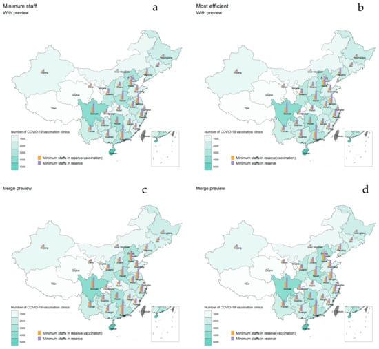 Optimal staffing to achieve the goals within 3 months. The green area in the map represents the number of COVID-19 vaccination clinics in each province, and the darker the color represents more COVID-19 vaccination clinics. The orange bar represents the minimum number of staff members needed to be stockpiled for the vaccination step at the vaccination clinics optimized by the simulation model under the goal of raising the booster vaccination rate to the full immunization level in 3 months in different scenarios. The higher the bar, the more healthcare workers needed to be stocked. The purple bar represents the minimum number of staff members to be stocked in the vaccination clinics, and the higher the bar, the higher the number of staff members are needed to be stocked. (a,b) Optimization when the vaccination clinic was equipped with preview, registration and vaccination steps; (c,d) Optimization when the preview and registration steps were combined.